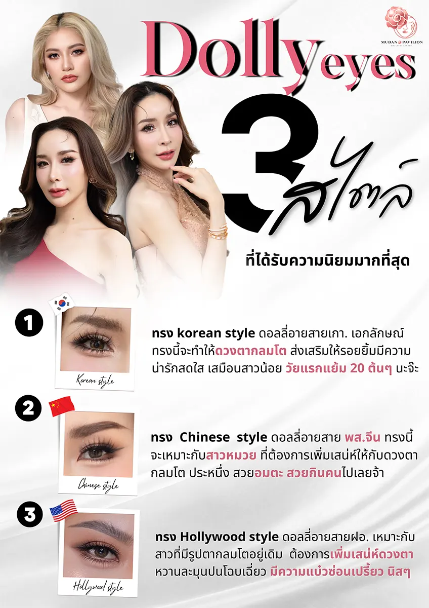 - Hollywood Style, Dolly Eyes, Western Style. Suitable for girls who already have big round eyes and want to add more charm to their eyes. Suitable for girls who already have big round eyes and want to add more charm to their eyes, making them sweet, gentle, and a bit charming.