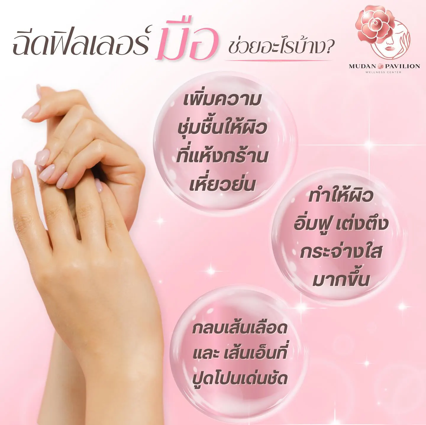 เป็นการฉีดสารเติมเต็มประเภท Hyaluronic Acid (HA) เข้าตรงบริเวณหลังมือ ซึ่งฟิลเลอร์จะเข้าไปกระตุ้นให้เกิดการสร้างคอลลาเจนขึ้นมาใหม่ ทำให้ผิวหลังมือเรียบเนียน ช่วยแก้ปัญหาเส้นเลือดปูดโป่ง และเส้นเอ็นที่หลังมือ นอกจากนี้ยังช่วยเพิ่มความชุ่มชื้นให้กับผิว และช่วยลดจุดด่างดำบริเวณหลังมือ