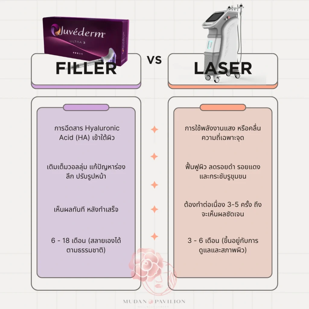 ถึงแม้ Filler กับ Laser หน้าใส จะมีจุดที่คล้ายคลึงกัน แต่ก็ยังมีความต่างกัน ตามตารางด้านล่าง