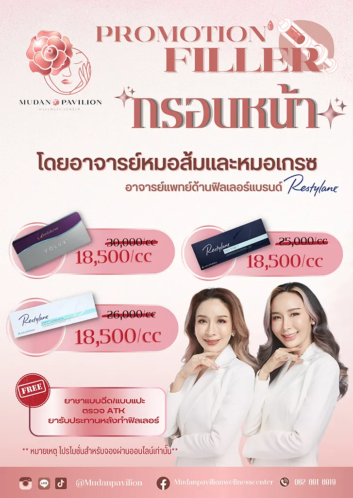 ตำแหน่งที่เหมาะ : ฟิลเลอร์ยกหน้า , ฟิลเลอร์แก้มส้ม , ฟิลเลอร์จมูก , ฟิลเลอร์กรอบหน้า(Jawline)